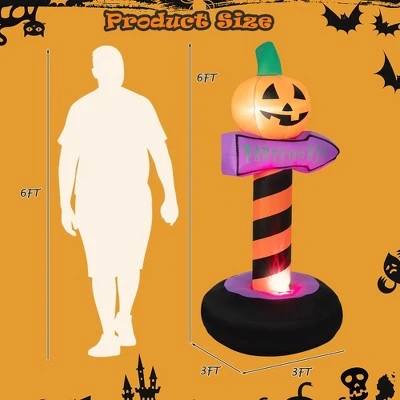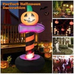 - Inviting Halloween Road Sign: This Halloween inflatable decoration is composed of a cute pumpkin with smile on face and a big road sign, writing “ PARTY THIS WAY” . It can guide your guests and dressed-up trick or treaters to your well-scripted Halloween party.