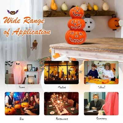 Decorate your home with our pre-lit ceramic Halloween pumpkin lantern to add more horror holiday atmosphere!Made of corrosion and abrasion resistant ceramic material, this tabletop pumpkin lantern has good performance and durability. Hand-painted surface with a great gloss is anti-fading and smooth for easy cleaning. It will automatically circulate through the evil pumpkin smile to emit a variety of colored lights. And 3-tier pumpkin lanterns with different sizes will attract ghosts to create a spooky feeling. What’s more, Energy-saving LED lights at the bottom are powered by 2 included button cells, which is easy to put anywhere. Compared with real pumpkin and candle, it is more cost-effective and user-friendly. The nostalgic appearance makes it an eye-catching addition in home, office, etc.