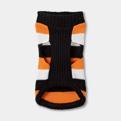 Get your furry friends in the Halloween spirit by dressing them in the Halloween Dog and Cat Sweater from Hyde & EEK! Boutique™. Made from 100% acrylic fabric for comfort and warmth, this pullover-style sweater features an orange, black and white-striped print for festive flair. Plus, it has two convenient front leg openings and a top slit for easy leash attachment, so you can bring your friends along for all your trick-or-treating fun.