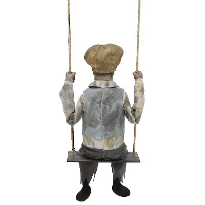 Everyone will be afraid to come up to your house with the Swinging Skeletal Boy around! This creepy prop features a Victorian-era skeletal boy with hollowed out eyes that glow an other-worldly blue and speaks haunting phrases to all passersby as his head turns side-to-side while he swings back and forth on his swing. Your haunted house will never be the same with the Swinging Skeletal Boy! Animation: Eyes glow blue Head turns side-to-side Swings back and forth on swing. Phrases prop says: Hello. Do you want to play? I’ve been swinging here waiting for you, for years and years. You have such nice skin…can I have it? (giggle) That’s okay, I’ll come get it when you’re sleeping. I’ll make you one of us, then you can swing forever too (giggle)! One, two, I’m a you, Three, four, breaking down your door, Five, six, beware of my tricks, Seven, eight, you will not escape, Nine, ten, this will never end! (Giggle) inches. Activation options: Steady-on, Infra-red sensor (works up to 6.5′ feet away & works in all lighting conditions), Step-here pad (included). Power: UL power adapter that plugs into any standard outlet. Materials: Polyester, PVC, sponge, plastic, hemp rope, electronics. Assembly required. Fixed height 62 inches, width 16 inches, animation right to 50 inches, depth 18 inches.