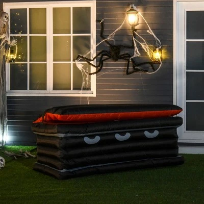 - Halloween Inflatable Information: Halloween Vampire and Coffin Dimensions: 70.75″ W x 31.5″ D x 31.5″ H. Includes four ground stakes, four drawstrings, and four sandbags.