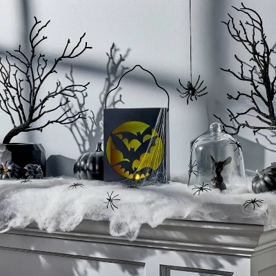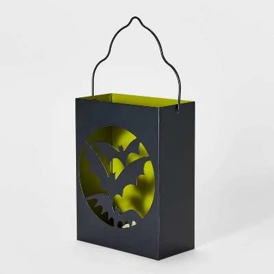 Add some glowing bat-titude to your home for Halloween with this Light-Up Bats Metal Halloween Decorative Lantern from Hyde & EEK! Boutique™. Made from metal in black and green, this decorative lantern features a front cutout of three bats and emits a bright, warm glow. Designed for indoor use, it’s the perfect size for placement on a table or countertop, either alone or as part of a larger Halloween display.