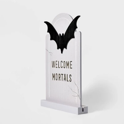 Haunt guests or trick-or-treaters with a spooky graveyard scene by using the Wood Cream “Welcome Mortals” with Bat Halloween Decorative Tombstone from Hyde & EEK! Boutique™. This decorative tombstone features the message “Welcome Mortals” along with a bat for spooky appeal. Made with wood, this decorative tombstone makes an amazing seasonal display whether you use it alone or pair with a posable skeleton, RIP tombstone and pumpkin figurines.