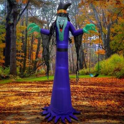 Shock your neighbors and guests with this 12ft Inflatable Halloween Witch. This creepy witch stands at a massive 12 feet tall wearing a full length purple dress with the classic black witches hat. Be the talk of the town this Halloween season by adding this witch to your lawn.
