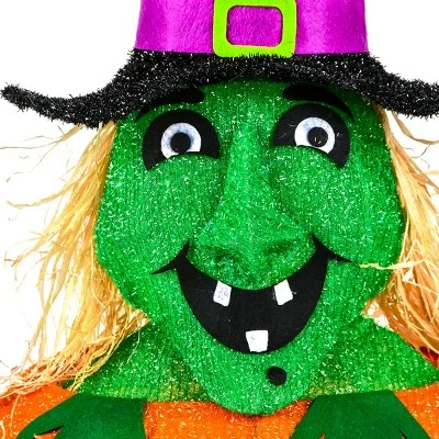 This Halloween decoration features a happy face jack-o-lantern with a green complexion, wide-smiling witch popping up from inside. It is constructed of a glittering tinseled fabric that is wrapped around a sturdy wire frame and lit from inside with 40 battery operated warm white LED lights. This fun and unique decoration can be displayed in indoor or covered outdoor locations.