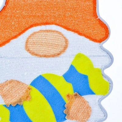 This fun and whimsical Halloween decoration is constructed of tinseled fabric over sturdy wire frames. Three white-bearded gnome characters each hold Halloween-themed item: wrapped candy, skull, and jack-o-lantern. The outside perimeter of each figure is lined with a neon style light strip containing hundreds of LED lights that produce an orange glow. A rear stand for each provides upright display and ground stakes are included for outdoor use.