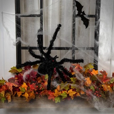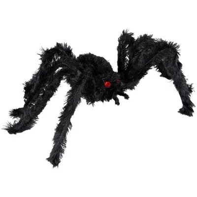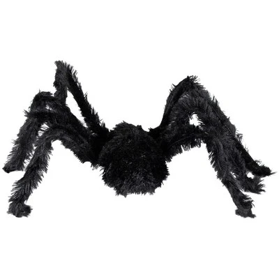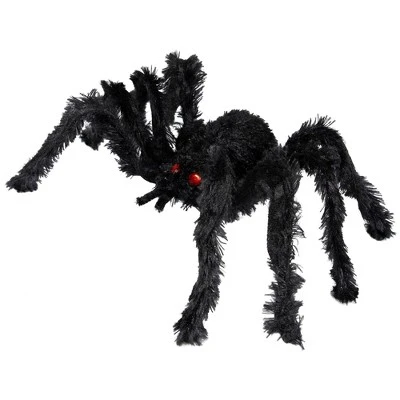 Embrace the frightful fun of Halloween with our fuzzy spider Halloween decoration. This large, spine-chilling spider boasts a grand presence with its fuzzy texture and menacing red eyes, making it a haunting addition to your Halloween decor. The sewn in wire legs allow for versatile positioning, drape it over furniture or it in unexpected places to create an eerie ambiance that will send shivers down your guests’ spines.Features:Halloween spider decorationBody is covered in black, fuzzy fabricBendable wire legs for easy positioningAccented with red jewel eyes For decorative indoor use only Dimensions: 5″H x 27.5″W x 8″D Material(s): fabric/foam/wire