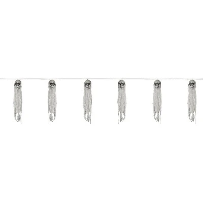 SGreat way to decorate for your Halloween Party! Plastic skulls draped with cheesecloth styling, attached to a cord. Each skull head with draping measures 18″ tall.