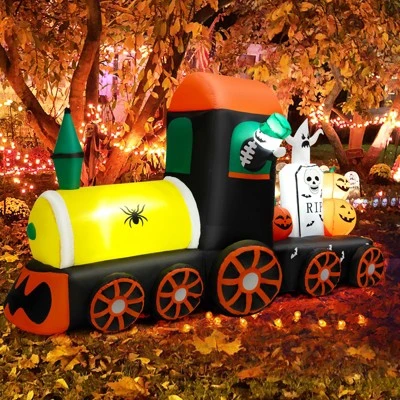 - Unique Design of Halloween Train: This Halloween inflatable decoration is in a unique train-shaped design. A fun-filled Halloween train loaded with classic Halloween characters, including a skeleton conductor, tombstone, ghost and Halloween pumpkins. Your courtyard would be the absolute focal point if you put such a set of inflatable decorations in it.