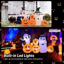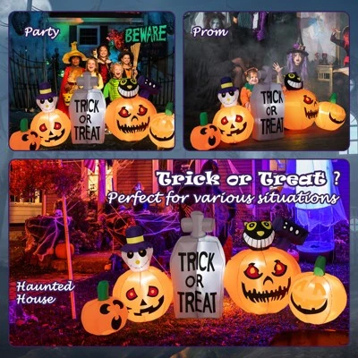 - 8FT Long Pumpkins with Tombstone: Composed of pumpkins and tombstone reaching 8ft long, the inflatable decoration greatly attracts and impresses people. Moreover, 2 pumpkins with green stems and the other 2 with black cat and ghost respectively, making the Halloween decoration more colorful and fit for Halloween