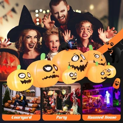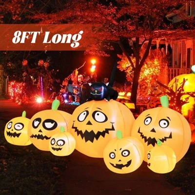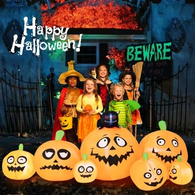 - Cute Inflatable Pumpkins Decoration: The inflatable pumpkins decoration measure 8ft long to be a wonderful choice for you to decorate your yard. Made up of 7 cute pumpkins of different sizes with different grimaces and an inflatable witch’s cat, it helps to create a unique view to add a Halloween atmosphere.