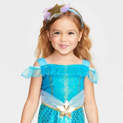 Introduce everyone to a cute mermaid at your next Halloween party by dressing up your toddler in the Ethereal Mermaid Halloween Costume Dress with Headpiece from Hyde & EEK! Boutique™. This blue mermaid costume dress features a mesh belt with a gold star buckle plus shimmery lace detailing for a beautiful look. Made from soft and lightweight fabric, the dress comes complete with a matching headpiece featuring a gold-tone star to complete the look.